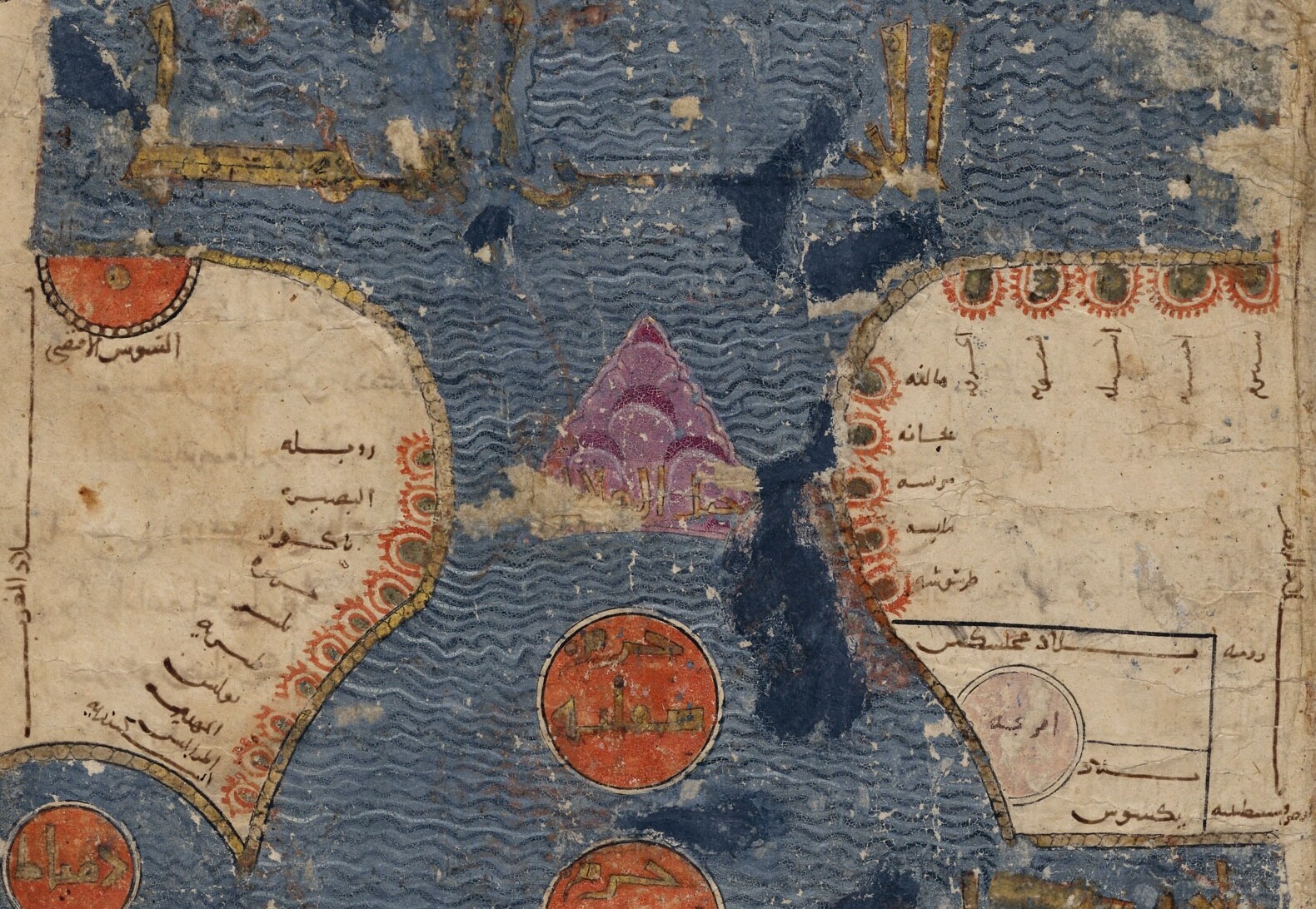 Interactive Late 12th-century Islamic Map of the Mediterranean Belonging to Frederick II from al-Istakhri’s Kitāb al-Masālik wa al-Mamālik (Book of Routes and Realms) abbreviated to KMMS. Courtesy: Leiden University Libraries. Codex Or. 3101, fol. 33. 589 AH / 1193 CE. Gouache and ink on paper. 34 × 26 cm.